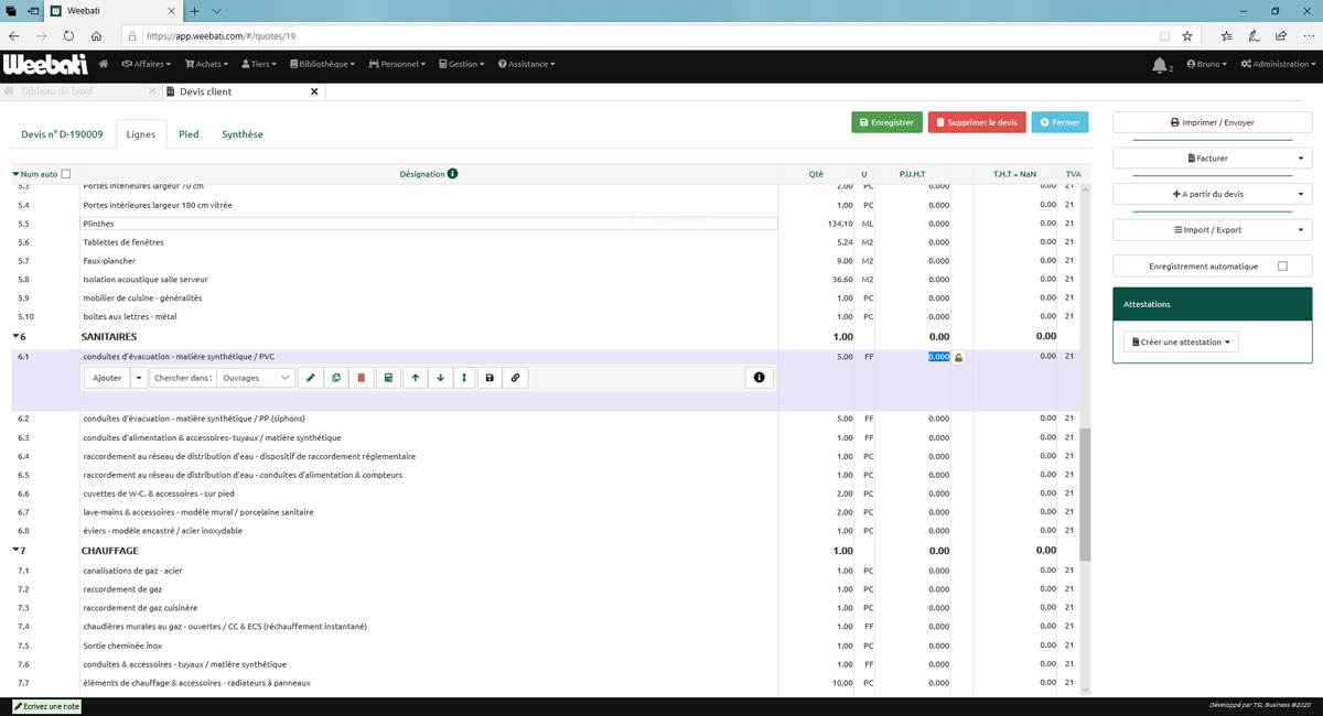 Enfin un logiciel pour créer simplement vos devis et vos factures et gérer vos chantiers. Vous allez gagner du temps ! Avec Weebati, vous pouvez enregistrer les matériaux et les ouvrages que vous créez afin de pouvoir les réutiliser facilement. Il ne vous reste qu’à adapter les quantités en fonction de chaque chantier. Entièrement en ligne, Weebati vous offre la liberté de l’utiliser partout et tout le temps !